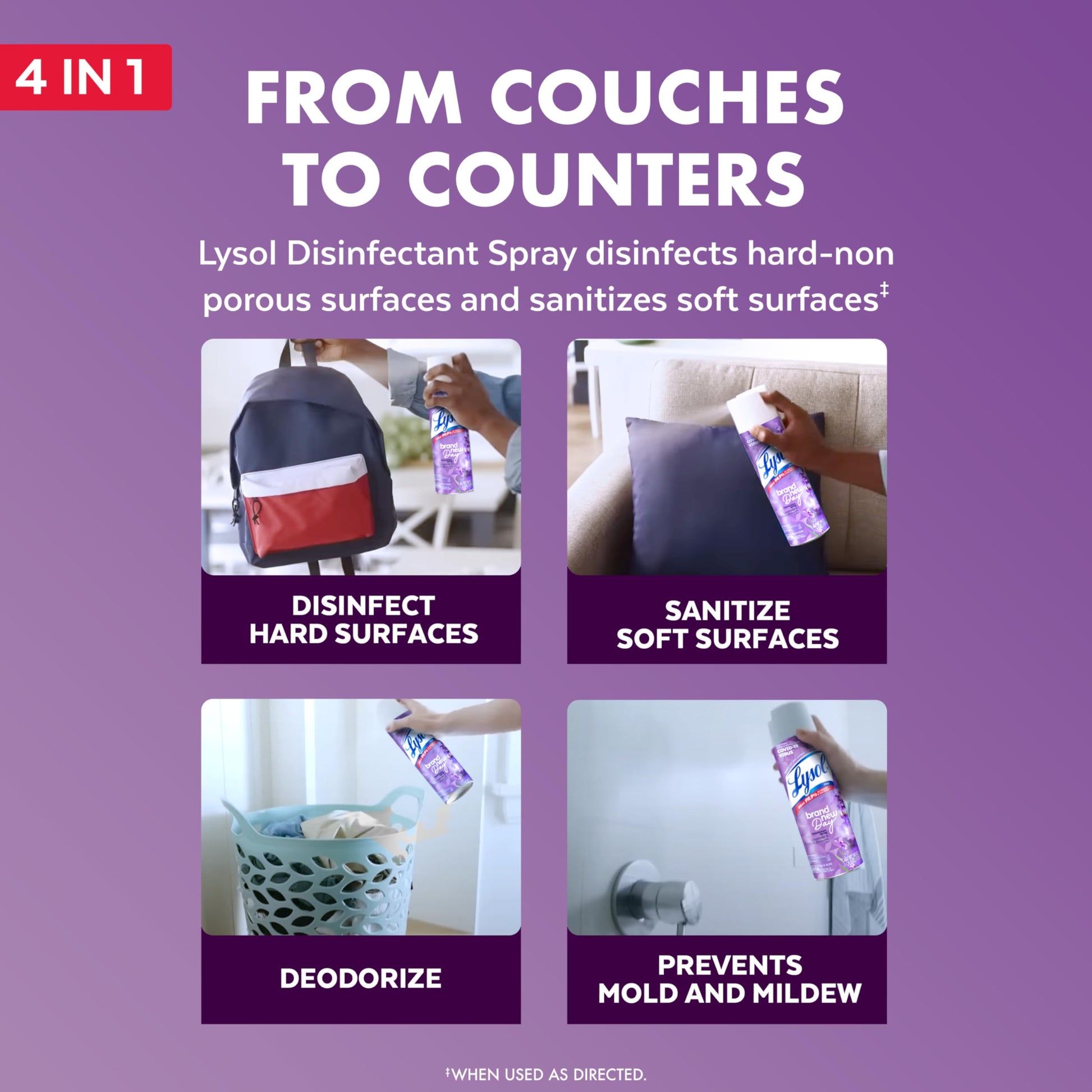 - DISINFECTING AND SANITIZING SPRAY: Lysol disinfects hard non-porous contact surfaces and sanitizes soft surfaces. This multi-purpose spray can be used in the home and kitchen, to disinfect kids toys, couches, counters , bathrooms, and over 100 more surfaces.